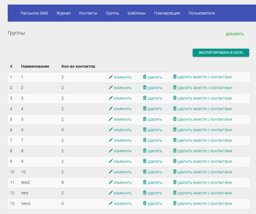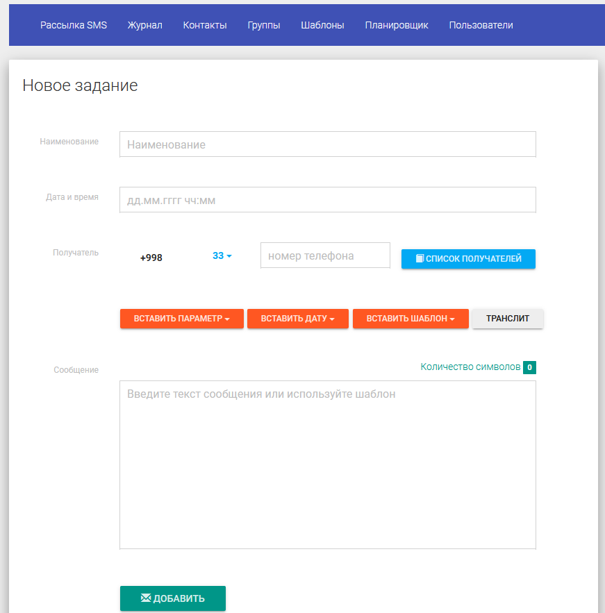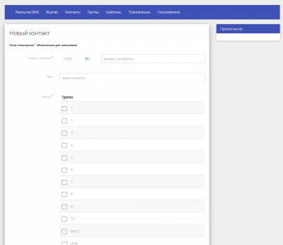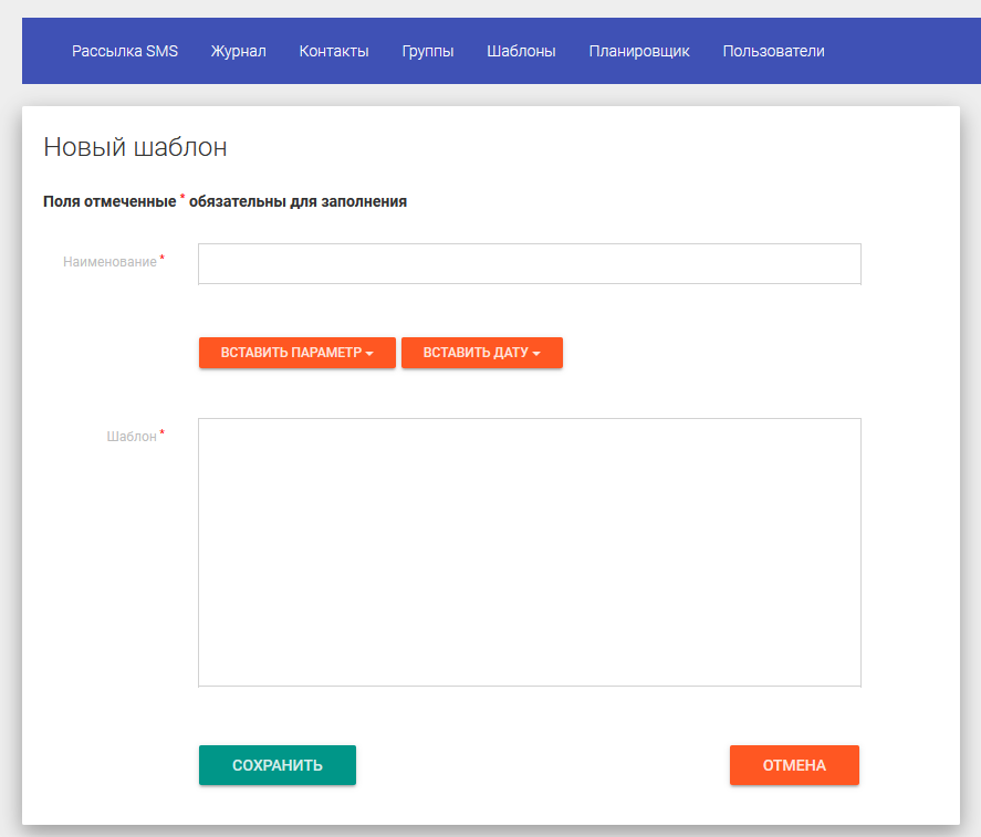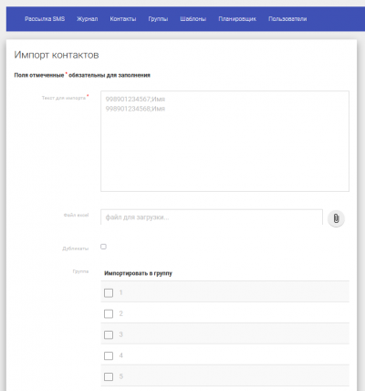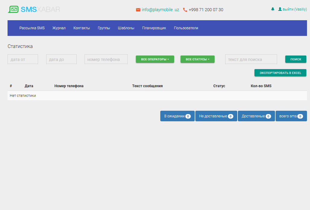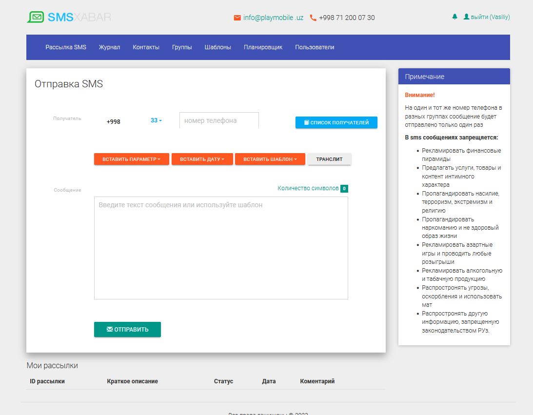 Поделиться через Поделиться через... Twitter Facebook Telegram WhatsApp TeamsОтправить по эл.почтеПечать × Содержание Рассылка SMS Выбор получателей. Текст рассылки. Журнал Контакты Добавление контактов Импорт контактов Дополнительные параметры Группы Добавление группы Шаблоны Добавление шаблона Планировщик Добавление запланированной рассылки. Рассылка SMS На этой странице формируется рассылка SMS-сообщений. Чтобы сделать рассылку необходимо: Указать получателей; Ввести текст сообщения; Отправить рассылку на модерацию (подтверждение рассылки). Выбор получателей. Существует 2 варианта указать получателей рассылки: Указать номер телефона получателя – в этом случае сообщение отправить только одному указанному получателю Указать группу получателей. Чтоб указать группу получателей необходимо кликнуть кнопку «список получателей». При клике на кнопку откроется форма выбора группы получателей. Начав набирать имя контакта в поле «введите имя контакта», появится список ваших контактов. В данном списке вы можете, кликнув на нужный вам контакт выбрать одного получателя. Вы можете, отметив галочкой название группы, добавить получателей относящихся к данной группе. Чтоб отправить рассылку всем контактам, вы можете поставить галочку напротив «Все контакты». Таким образом, все введенные и отмеченные контакты и группы контактов попадают в список рассылки. Текст рассылки. В поле «Сообщение» вводиться текст сообщения для рассылки. Для удобства предусмотрены дополнительные готовые шаблоны и параметры для сообщения: Вставить параметр – здесь вы можете выбрать параметр для контакта, например, имя контакта или любой другой параметр, которые вы сможете создать динамически в дальнейшем. В каждом SMS-сообщении подставляется параметры данного контакта. Вставить дату – здесь шаблоном подставляется выбранная вами дата в сообщение. Вставить шаблон – здесь можно выбрать и вставить ваши готовые шаблоны сообщений, которые были заранее занесены вами в систему. Транслит – кнопка транслитерации текста с кириллицы на латиницу. Так же предусмотрен подсчет символов в сообщении. После того, как вы выбрали получателей и ввели текст сообщения, нажмите кнопку отправить, чтобы ваша рассылка была направлена на рассмотрение к модератору. В нижней части формы в блоке «Мои рассылки» вы можете следить за статусом вашей рассылки. Журнал На этой странице вы можете следить за статистикой ваших рассылок. Все рассылки состоят из SMS-сообщений. На данном экране выводиться статистика по отправленным SMS-сообщениям. В статистику попадают только одобренные модератором сообщения. Есть возможность фильтрации сообщений по дате отправки, по номеру телефона, по оператору сотовой связи, по статусу, а также по тексту сообщения. Так же существует выгрузка отфильтрованной статистики в файл Excel. Существует 3 статуса сообщений: В ожидании – сообщение передано сотовому оператору, клиент пока не получил SMS-сообщение. Доставлен - SMS-сообщение было успешно доставлено до абонента. Не доставлен - SMS-сообщение не было доставлено до абонента, по ряду причин (абонент не доступен, телефон выключен, номер телефона не активен или не существует и т.д.) Контакты Данный модуль предназначен для управления контактами. Тут вы можете добавлять, удалять и редактировать контакты. При входе на страницу контактов 